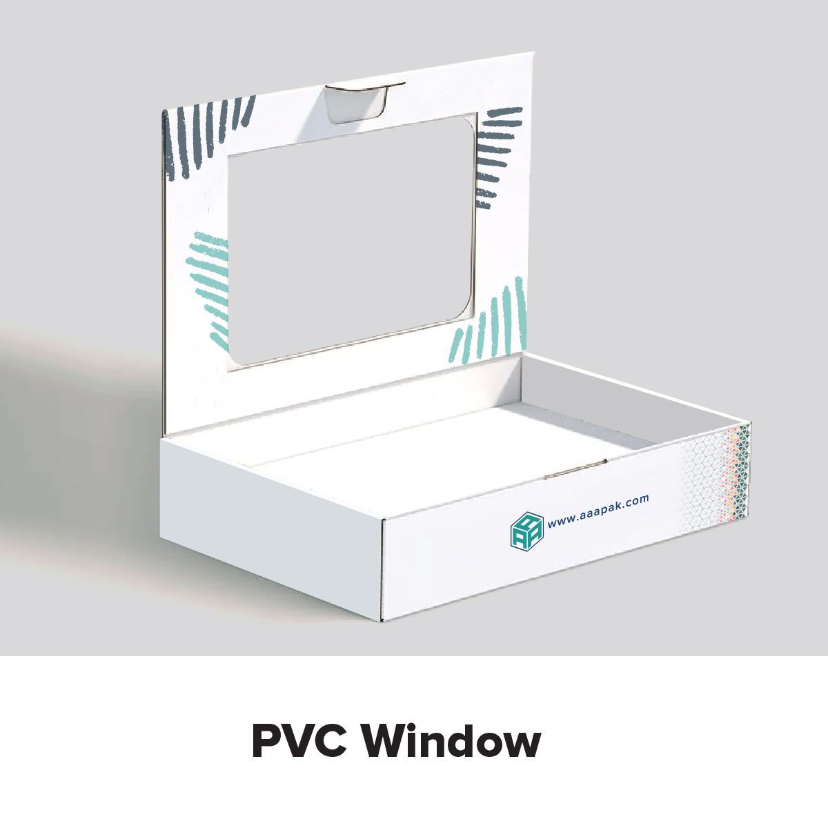 A functional packaging feature where a transparent film is applied behind a die-cut opening, allowing clear product visibility while maintaining structural strength.