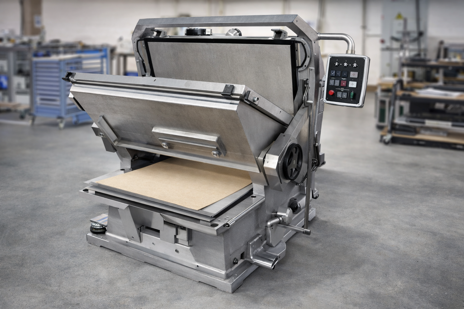 Designed around a hinged open-and-close motion, the clamshell press applies pressure by bringing two dies together. The sheet is placed between the dies, allowing precise embossing or debossing with controlled depth. This press type is commonly used for short runs and detailed work.