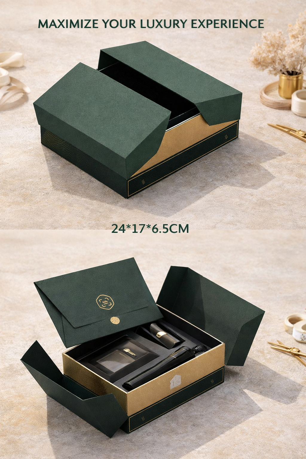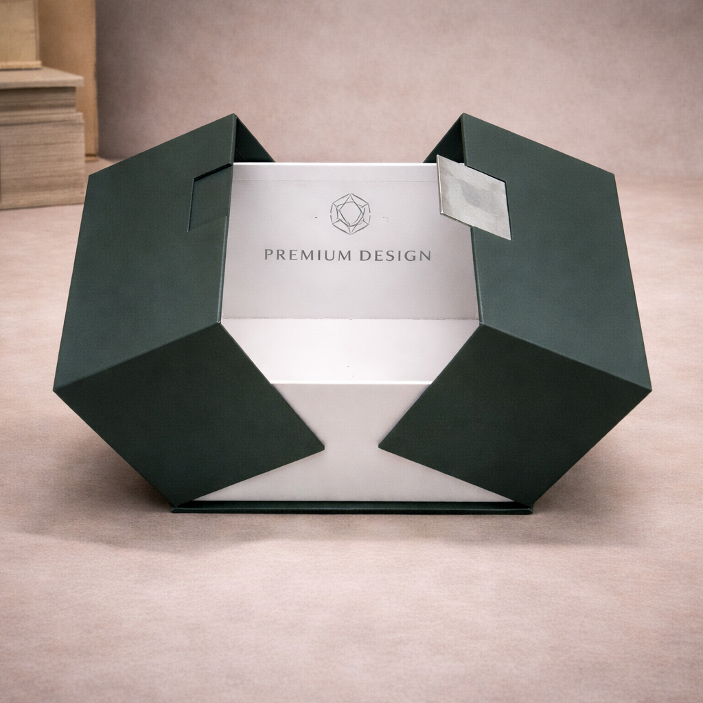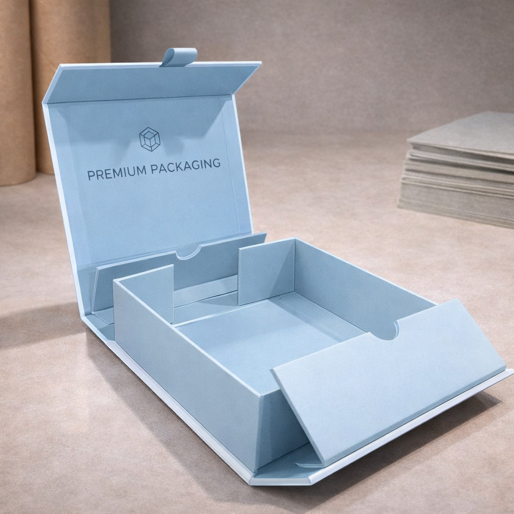Book style magnetic boxes open like a hardcover book, creating a dramatic and memorable reveal. Built with rigid chipboard and magnetic closures, this structure offers both durability and elegance. Widely used for luxury branding, promotional kits, and high-value gift packaging.