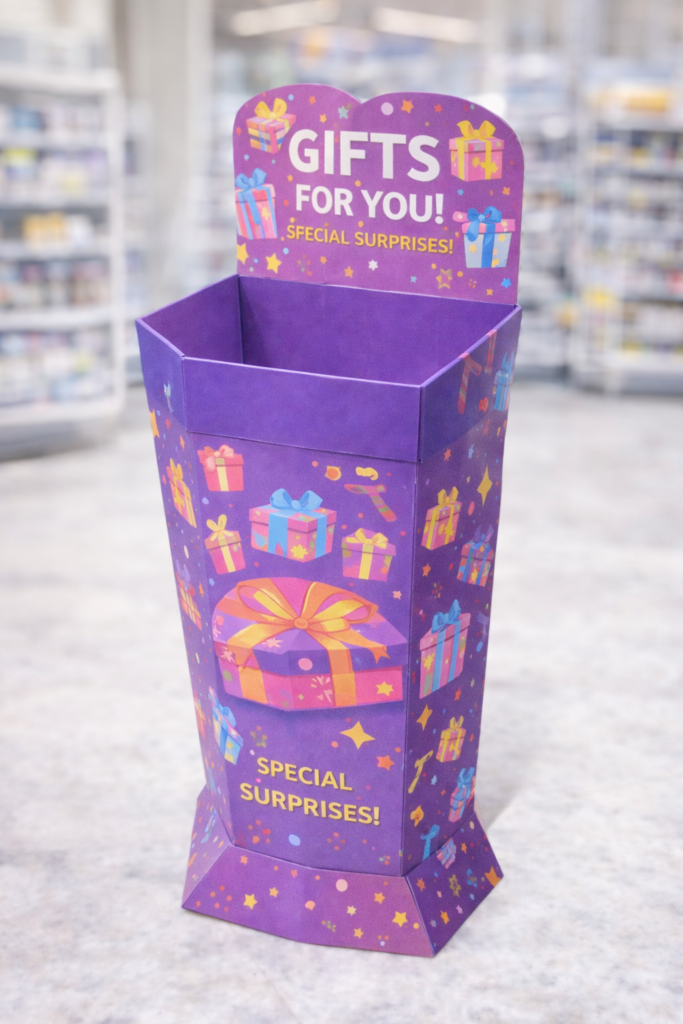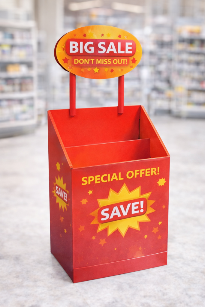 Minimum order quantities vary based on the bin size, depth, board grade, and printing specifications. Since dump bins can be produced in different formats for bulk merchandising, the final MOQ is confirmed after reviewing your display requirements.