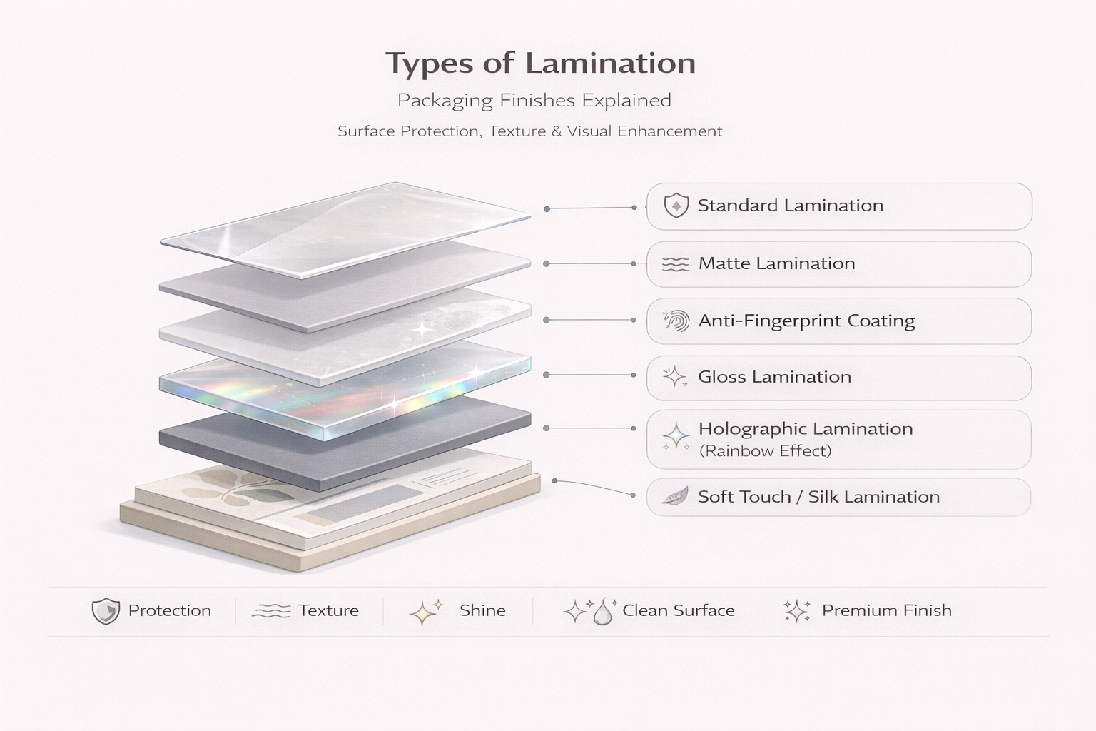 Lamination is a protective surface finishing process where a thin plastic film is bonded to printed packaging materials. This clear layer enhances visual appeal while providing added strength, durability, and moisture resistance. Commonly used on folding cartons and flexible packaging, lamination helps preserve artwork quality, improves shelf life, and gives packaging a more premium, polished appearance.