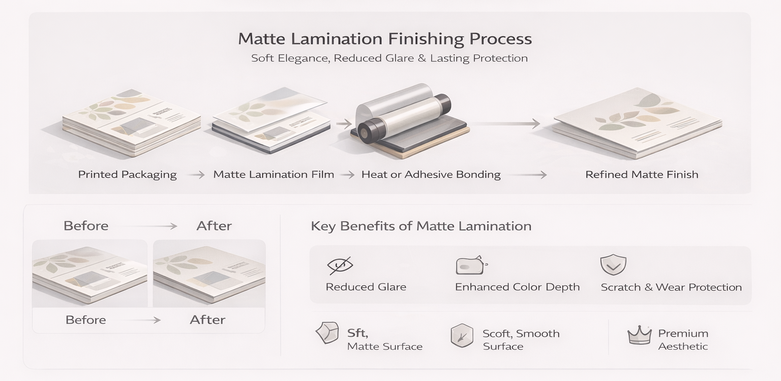 Matte lamination provides a smooth, non-glossy surface that delivers a subtle, elegant, and modern appearance. It reduces glare while enhancing color depth, making it a preferred choice for premium and minimalist packaging designs.