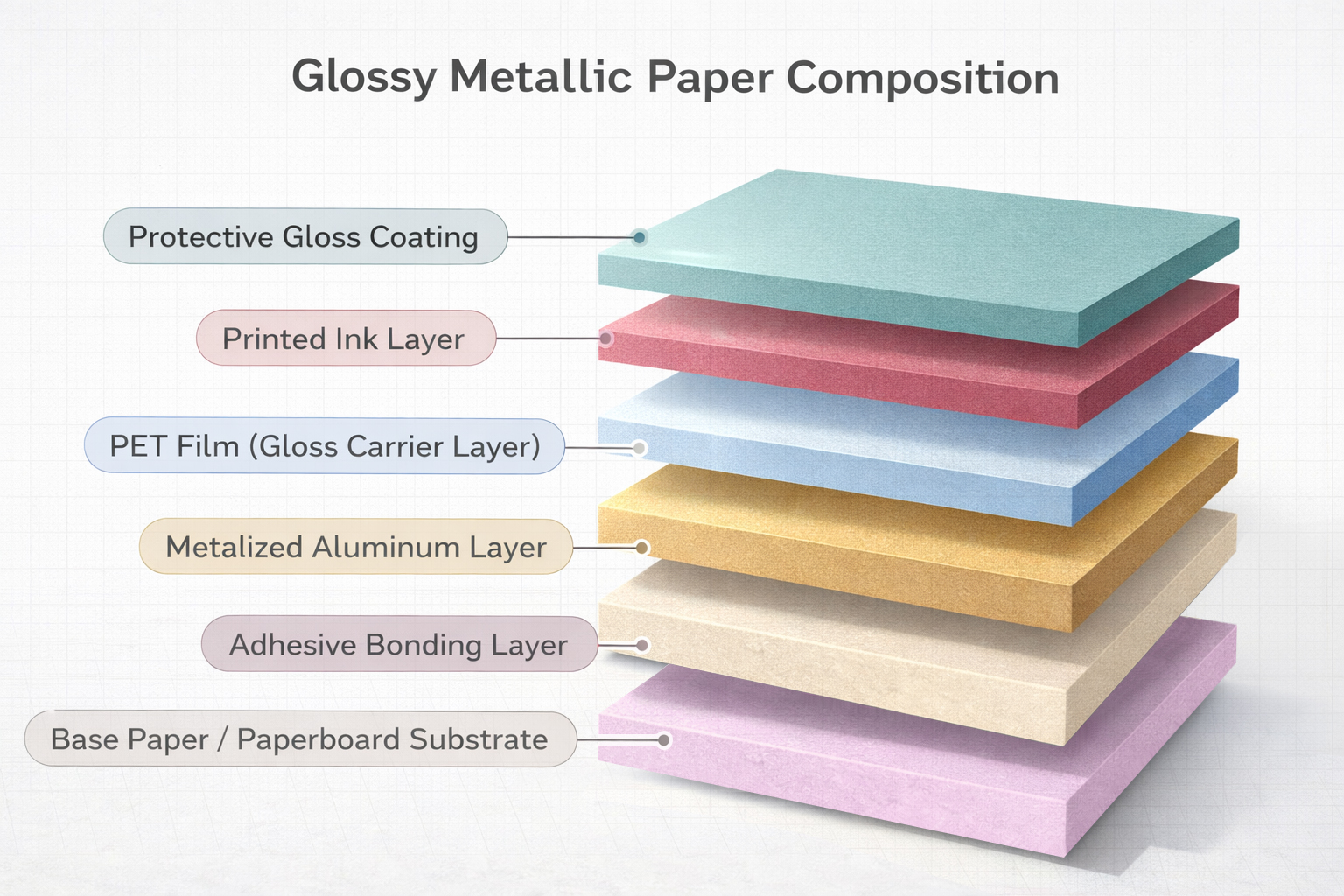 Glossy Metallic Paper is engineered to deliver a high-shine, mirror-like surface that maximizes visual impact. The structure begins with a sturdy paper or paperboard base, bonded with an adhesive layer to a metallized aluminum film. A PET carrier layer supports the metallic finish, followed by a printed ink layer for graphics and branding. The composition is completed with a protective gloss coating that enhances reflectivity, color vibrancy, and surface durability.