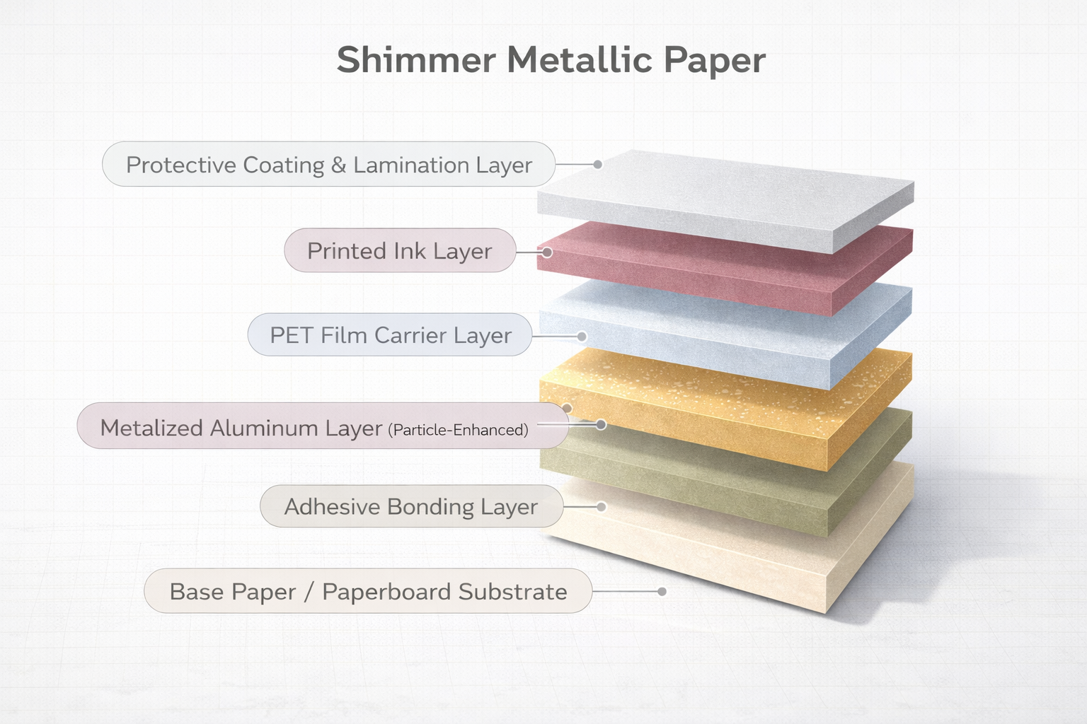 Shimmer Metallic Paper is designed to create a dynamic, light-reactive surface with a subtle sparkle effect. The construction includes a base paper or paperboard substrate, an adhesive bonding layer, and a particle-enhanced metallized aluminum layer that introduces texture and shimmer. A PET film carrier supports this metallic layer, followed by printed inks for design elements. The top protective coating and lamination seal the structure, enhancing durability and surface consistency.