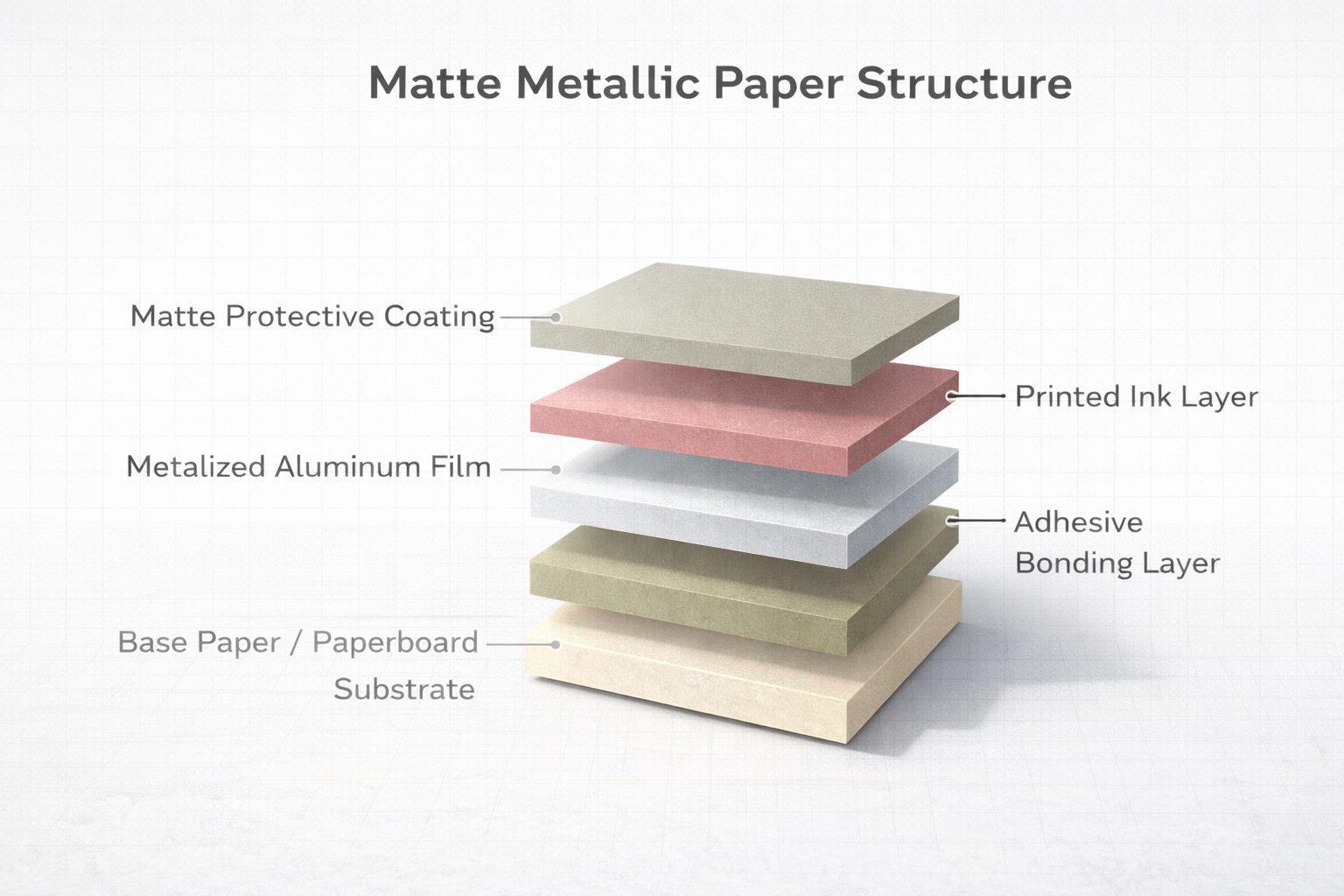 Matte Metallic Paper offers a refined metallic appearance with a soft, low-gloss finish. Its structure features a strong base paperboard substrate bonded to a metallized aluminum film using an adhesive layer. Printed inks sit above the metallic layer, delivering controlled color and contrast without excessive shine. A matte protective coating on the top surface reduces glare while adding scuff resistance and a smooth tactile feel.