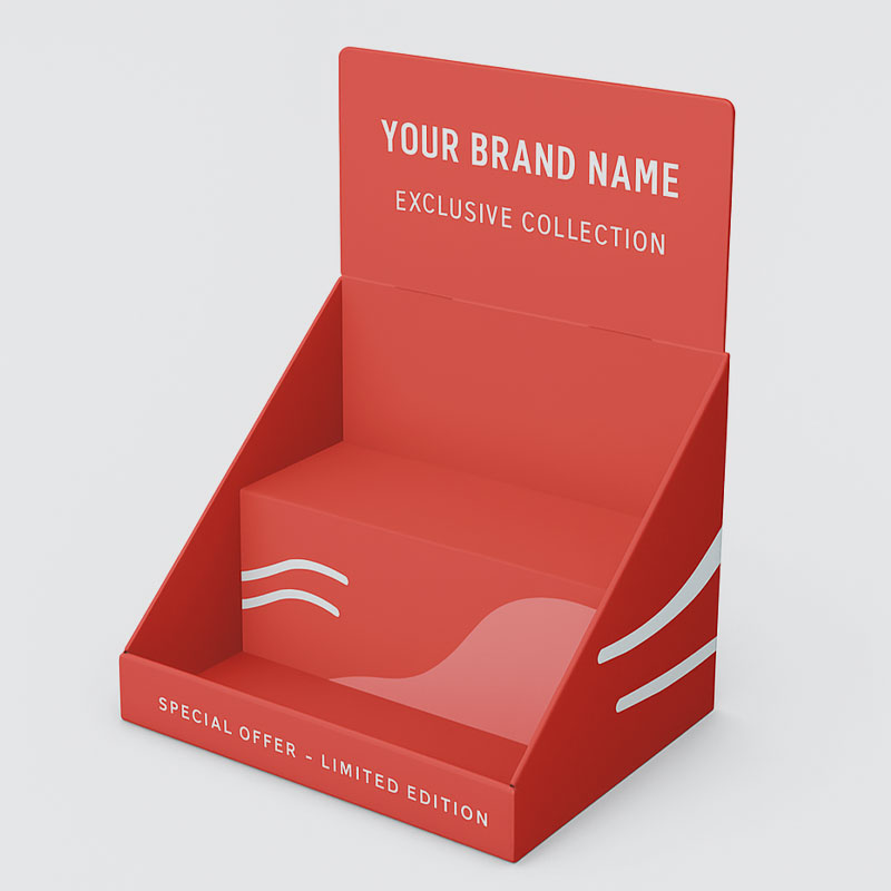Neutral beige finish complements premium branding; three deep shelves keep boxed items organised at eye level.