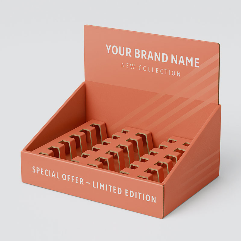 Contains a die‑cut insert to cradle bottles or vials, keeping every piece upright and visible for quick shopper selection.