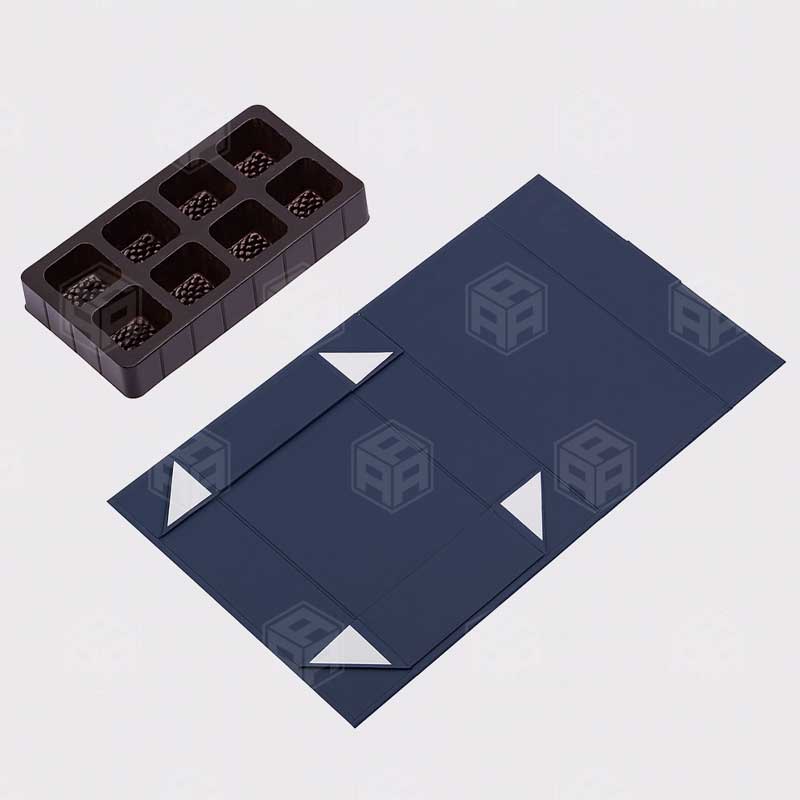 Folding magnetic box that integrates a blister insert, keeping sweets secure and perfectly displayed during transit.