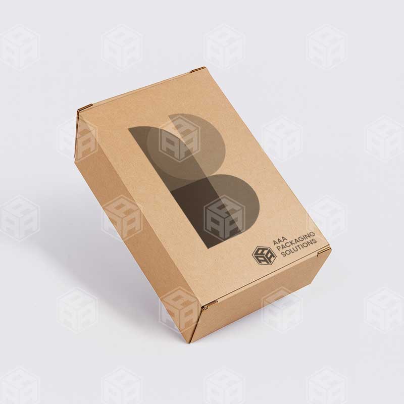 A functional packaging feature where a transparent film is applied behind a die-cut opening, allowing clear product visibility while maintaining structural strength.