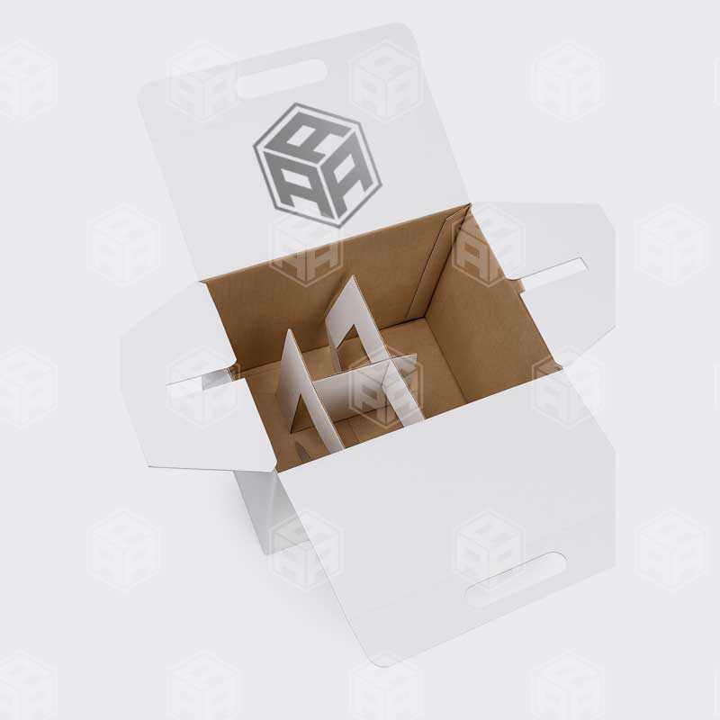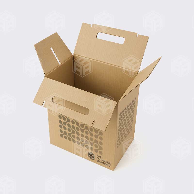 LoginCorrugated carrier with cell dividers and die‑cut handle, built to transport multiple wine bottles safely and stylishly.