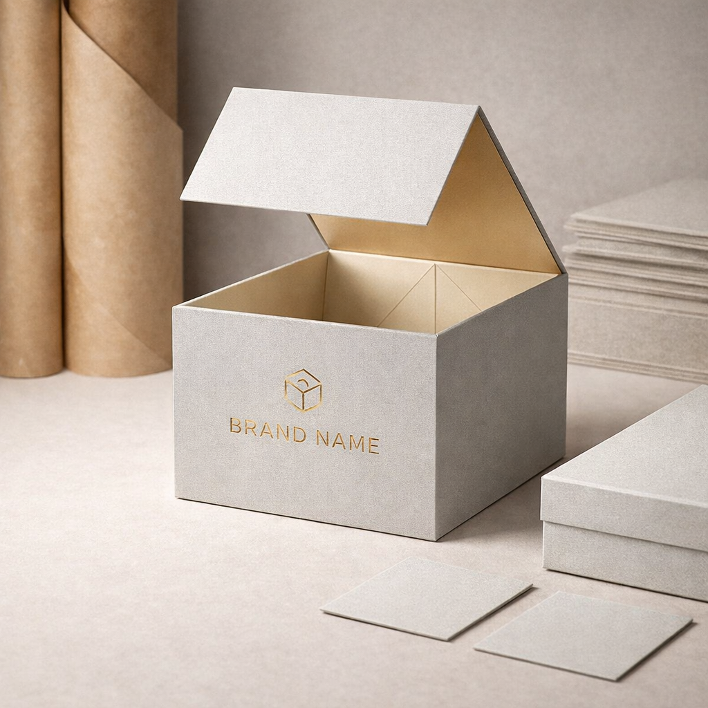 High-density chipboard and specialty papers are precisely cut to size. These materials form the strong foundation that gives rigid boxes their durability and structure.