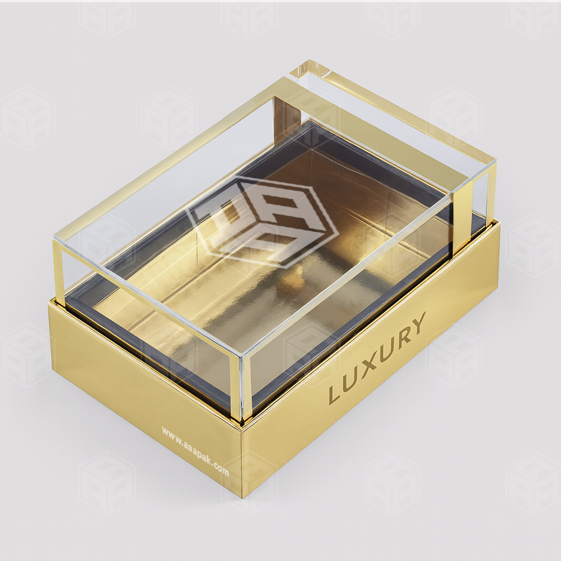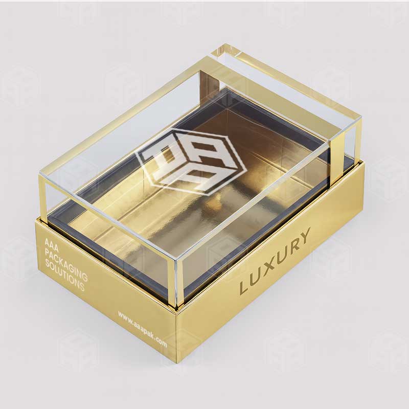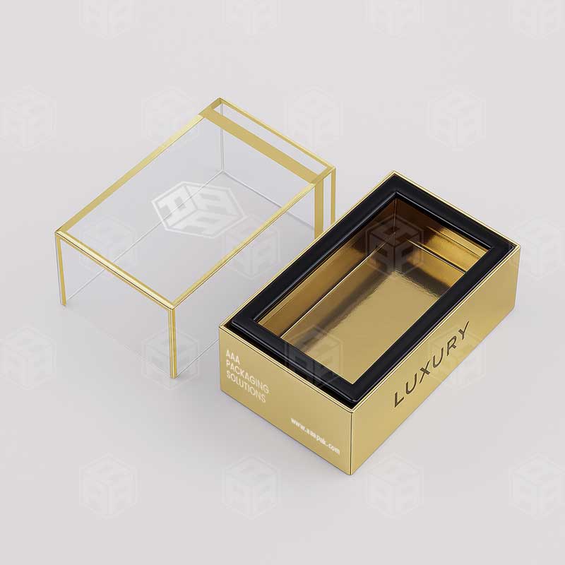 Premium two-piece rigid box with a transparent lid, crafted to present perfumes and luxury scents attractively.