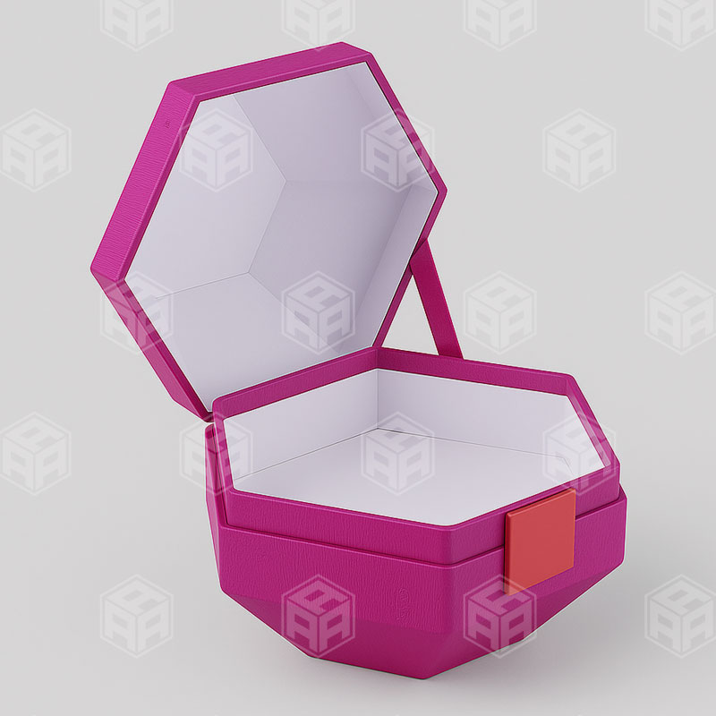 A unique six-sided hinged box with exterior locking design, perfect for creative product packaging.