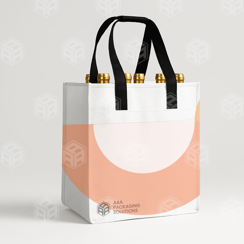 Square‑bottom tote tailored for wine or specialty beverages, featuring crisp graphics and wipe‑clean interior lining.