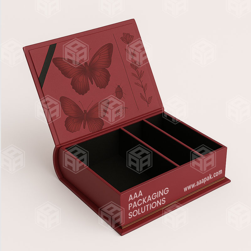 Featuring a hinged, book-like opening that unfolds smoothly from one side, this box style creates a deliberate reveal while maintaining consistent alignment and stability. Crafted from high-density chipboard, book style rigid boxes offer excellent strength, durability, and protection for premium products.