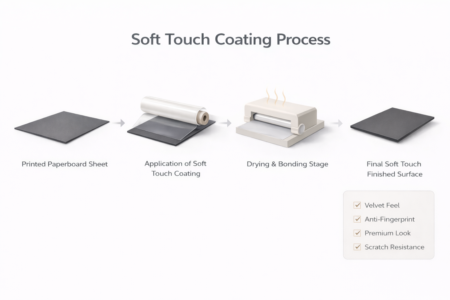 A specialized soft-touch film is laminated onto the printed surface using controlled pressure and heat.