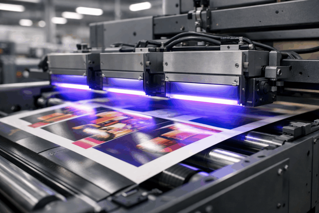 Printed material passes under UV lamps immediately after ink application.