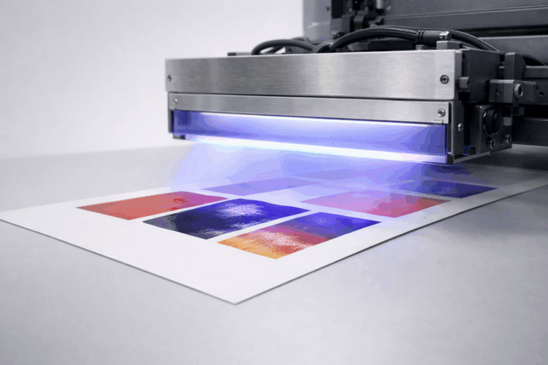 In UV printing, specially formulated UV inks are applied to the substrate. As soon as the ink is laid down, it passes under a UV lamp that emits ultraviolet light. This light triggers a chemical reaction that instantly solidifies the ink.
